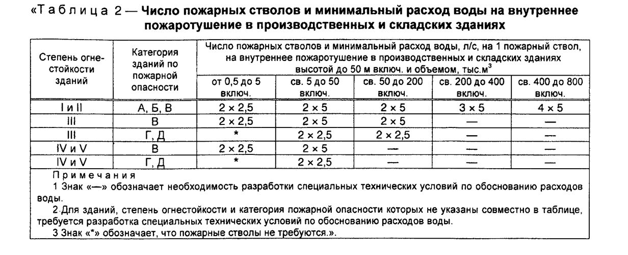 Согласно пункту 4.1.1 СП 10.13130.2009, который принят в соответствии с Федеральным законом от 22 июля 2008 г. N 123-ФЗ "Технический регламент о требованиях пожарной безопасности", «Для жилых и общественных зданий, а также административно-бытовых зданий промышленных предприятий необходимость устройства внутреннего противопожарного водопровода, а также минимальный расход воды на пожаротушение следует определять в соответствии с таблицей 1, а для производственных и складских зданий - в соответствии с таблицей 2.