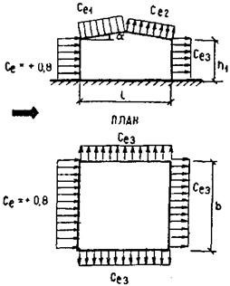 2. Принципиальные схемы действия нагрузок на стены и покрытие прямоугольных в плане зданий с двускатными покрытиями, возникающих от ветрового воздействия, представлена на схеме 2 приложения 4 утратившего силу СНиП 2.01.07-85* Нагрузки и воздействия, а именно: