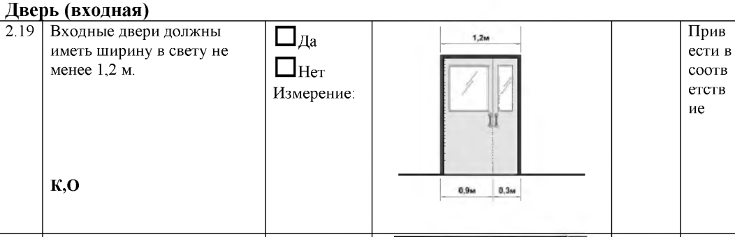 3. Вышеизложенное подтверждается и в материалах, подготовленных с участием специалистов Минтруда России до утверждения СП 59.13330.2016. Например, в «Раздаточном материале информационно-методических семинаров по распространению идей, принципов и средств формирования доступной среды для инвалидов и других маломобильных групп населения для специалистов органов управления и учреждений системы социальной защиты населения и иных ведомств, участвующих в формировании доступной среды жизнедеятельности для инвалидов и других маломобильных групп в рамках реализации государственной программы Российской Федерации «Доступная среда» на 2011-2015 годы в 2013 году», подготовленном в 2013 году под редакцией заместителя директора Департамента по делам инвалидов Министерства труда и социальной защиты Российской Федерации Гусенковой А.В (документ доступен по адресу: http://www.tavra-school.ru/doc/16-17/formirov-dostup-sredy.pdf) в Разделе 2 темы № 8 в пункте 2.19 приведена визуализация требований пункта 5.1.4 СП 59.13330.2012 с обозначением требуемого размера просвета под основное (рабочее) полотно двустворчатого входного блока - 0,9 м, а именно: