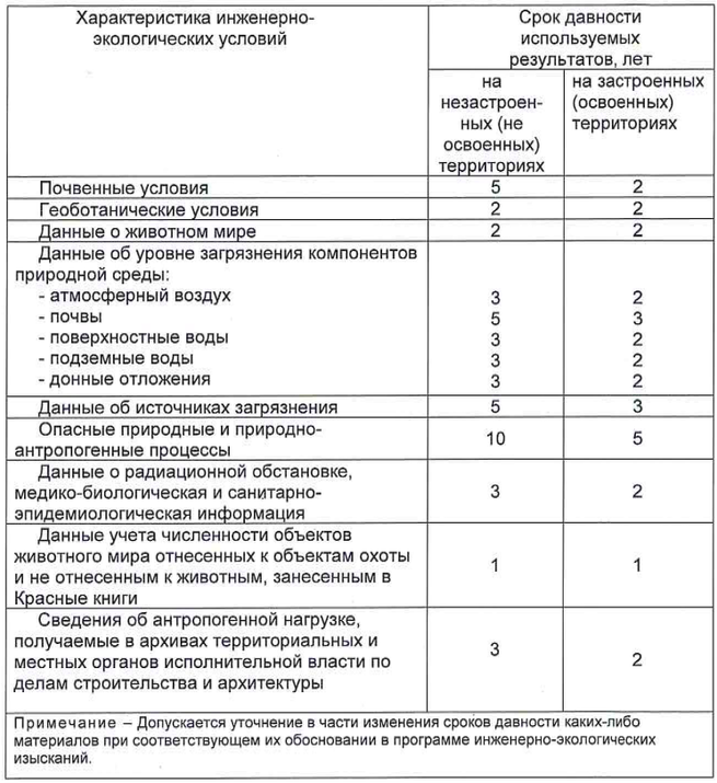 4. «8.1.7 При выполнении инженерно-экологических изысканий возможность использования результатов изысканий прошлых лет (без проведения новых изысканий) устанавливается с учетом их срока давности и произошедших изменений экологической обстановки. Для установления динамики изменения экологической ситуации (состояния окружающей среды) следует использовать материалы инженерно-экологических изысканий прошлых лет и фондовые материалы дистанционного зондирования Земли, полученные с применением различных видов съемок.