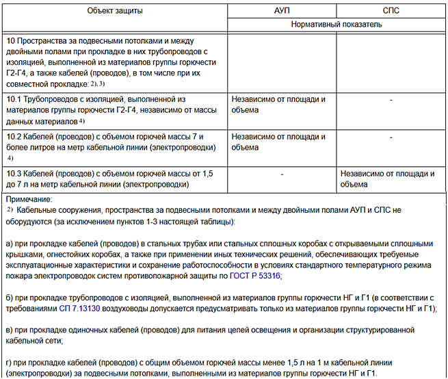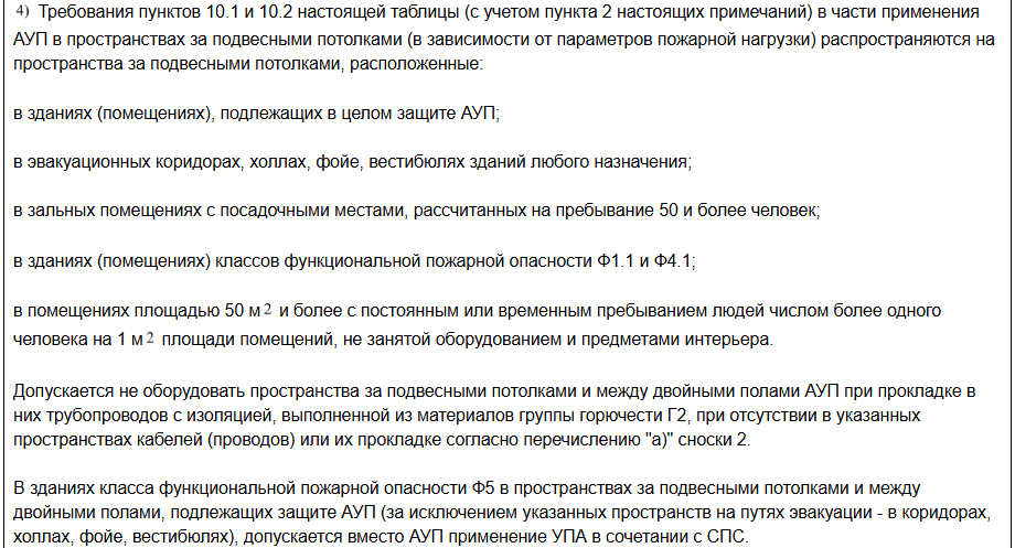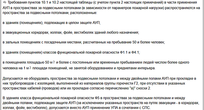 В двух последних абзацах Примечания 4 приводятся случаи (исключения) в которых допустимо не оборудовать пространства за подвесными потолками и между двойными полами АУП. Во всех остальных случаях при наличии между двойными полами трубопроводов и кабелей, перечисленных в пп. 10.1 и 10.2 Таблицы 2 пространства между двойными полами должны оборудоваться АУП.