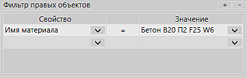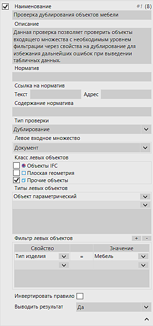 Как можно видеть, в этом правиле используется только одна группа объектов – Левое множество. В качестве отбираемых объектов выберем Прочие объекты, в этот класс входят также и объекты BIM Строительство. После отбора класса объектов, выбираем Тип – Объект параметрический, а также дополнительно настраиваем фильтр отбора объектов, в виде свойства объекта и его значения.