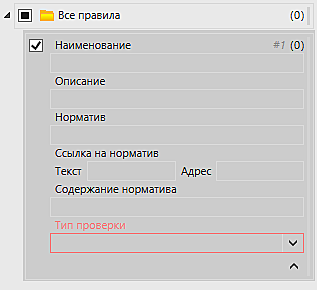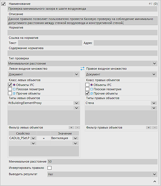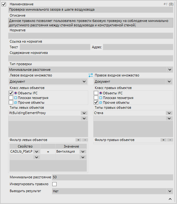 Как мы видим на этом примере, в проверке минимального расстояния необходимо, кроме прочих стандартных данных, заполнить информацию по минимальному расстоянию в миллиметрах. Следовательно, в ряде проверок присутствуют дополнительные обязательные к заполнению атрибуты, характерные для соответствующих проверок.