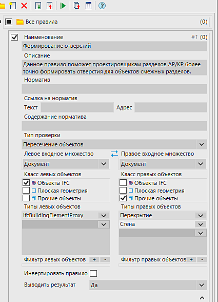 Разберем принцип работы инструмента Проверка модели на примере нескольких базовых вариантов проверки. Для начала посмотрим, как можно упростить формирование отверстий путем проверки между объектами IFC и элементами BIM Строительство. Создадим новое правило с настройками, показанными на рис. 13.