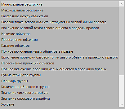 - Наличие объектов – наличие хотя бы одного правого объекта в пределах левого или в пределах расстояния относительно левого.