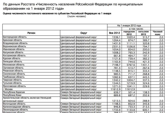 Базовые показатели – численность населения, по данным Росстат «По данным Росстата «Численность населения Российской Федерации по муниципальным образованиям на 1 января 2012 года, тыс человек», отсюда и далее на Росстат. Нормализуем, убираем дубли и вхождения, добавляем к таблице часовой пояс в соответствии с ПП (постановлением правительства) № 725 от 31 августа 2011 г. или в WiKi – Часовые пояса России.