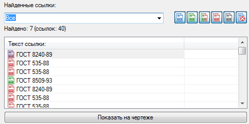 Рис. 4. В результате поиска панель НОРМААУДИТ составляет список ссылок на нормативно-технические документы, которые используются в чертеже, указывая при этом статус действия этих документов