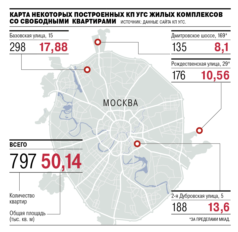 По данным сайта КП УГС, у предприятия в продаже находится почти 797 квартир общей площадью более 50 тыс. кв. м (см. подробнее карту). По подсчетам коммерческого директора «Миэль-Новостройки» Анны Шишкиной, сегодня в Москве в построенных жилых комплексах нераспроданными остаются 1,158 тыс. квартир в сегменте экономкласса (общая площадь — 65,3 тыс. кв. м) и 3,2 тыс. квартир комфорткласса (192,8 тыс. кв. м). «Разумеется, девелоперам рассматриваемый механизм может оказаться на руку, поскольку они от продажи городу в рамках программы реновации смогут выручить почти 35,5 млрд руб.»,— заключает эксперт.