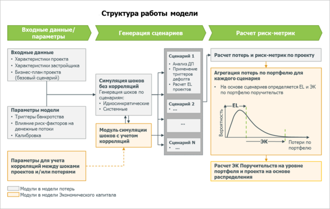 Модель обеспечивает как статистическую оценку риска проекта (на основании его бизнес-плана и прочих характеристик с учетом моделируемых риск-факторов) так и экспертную оценка риска на основании целого ряда факторов (см. схему).